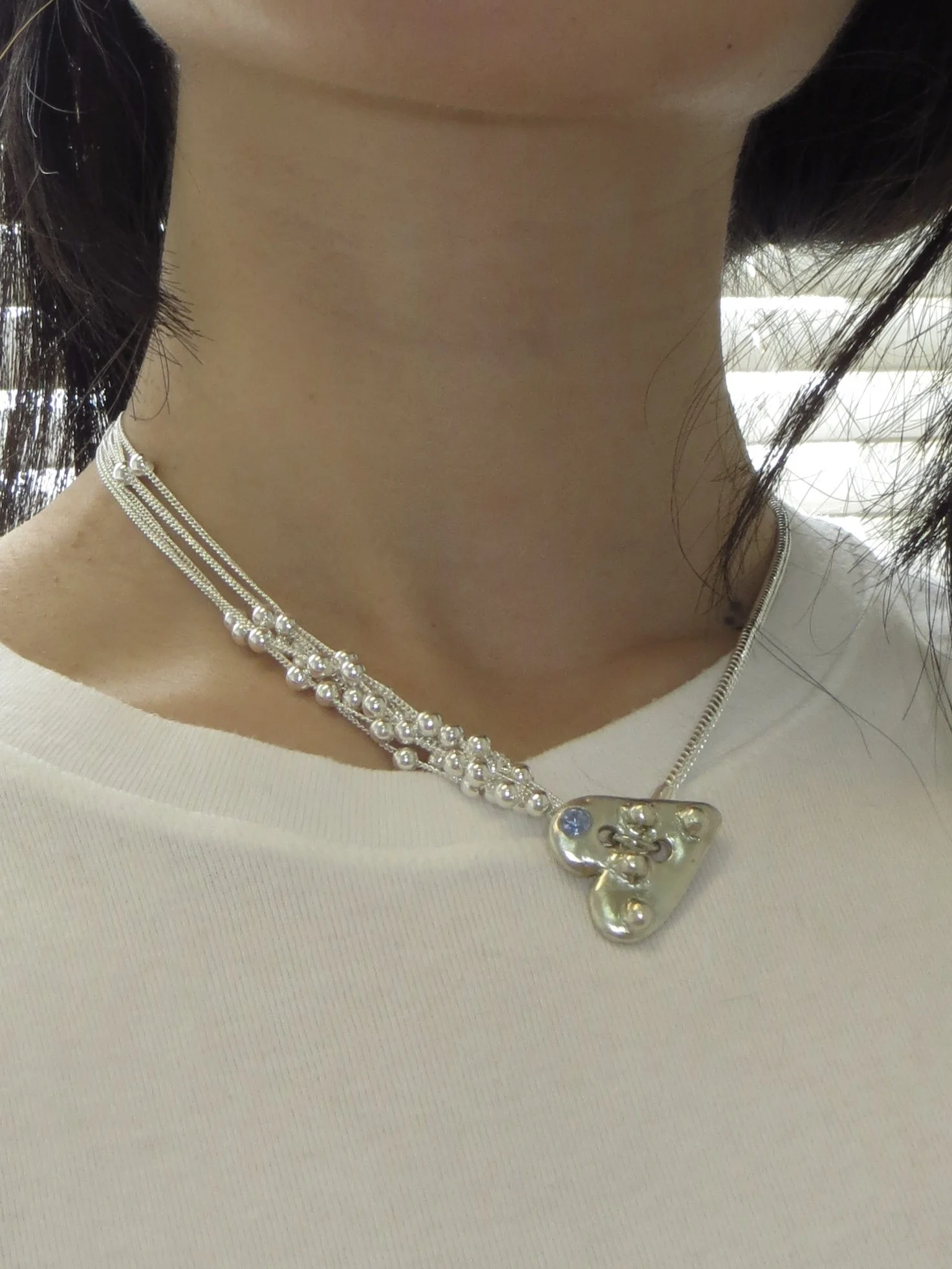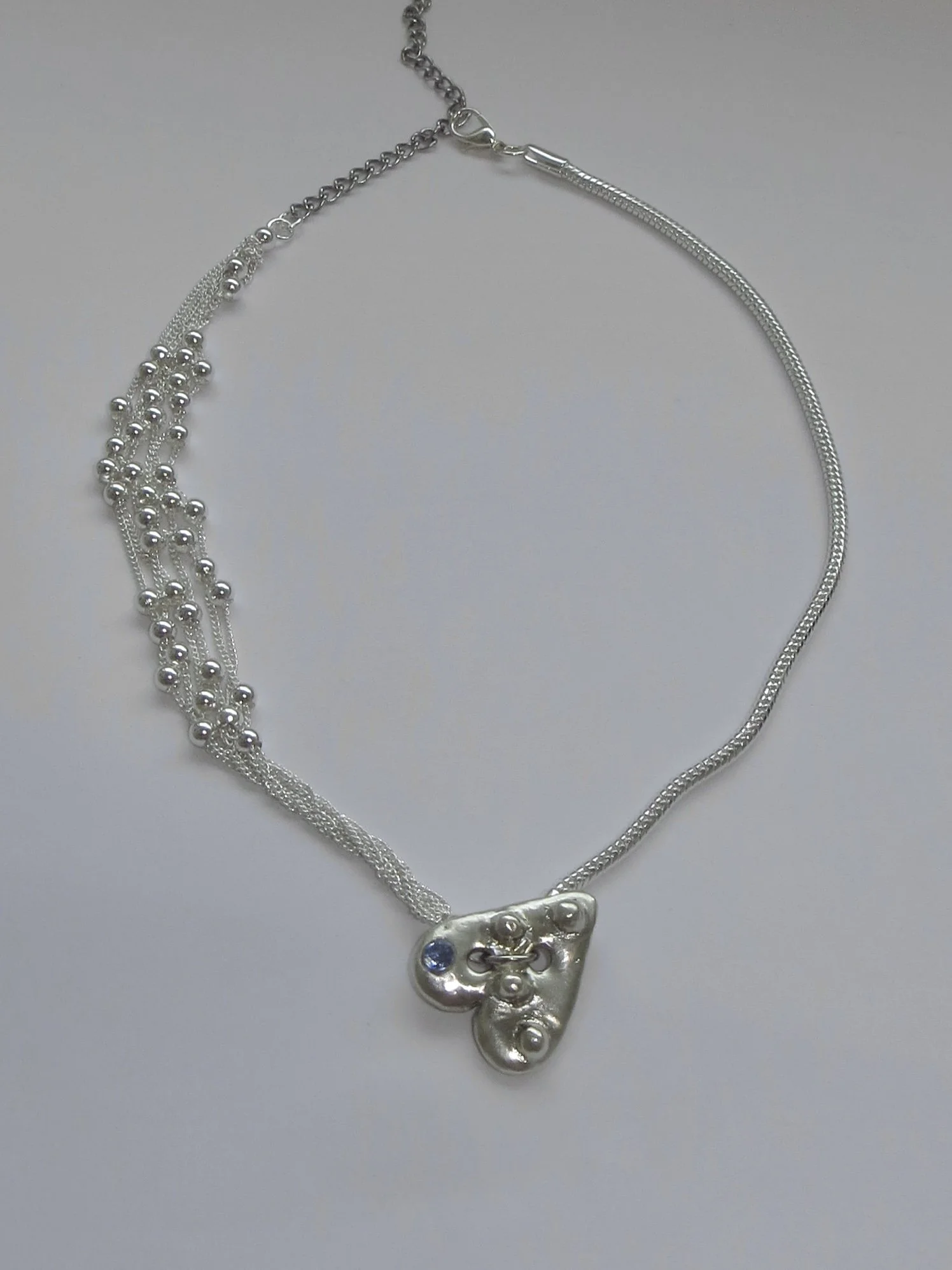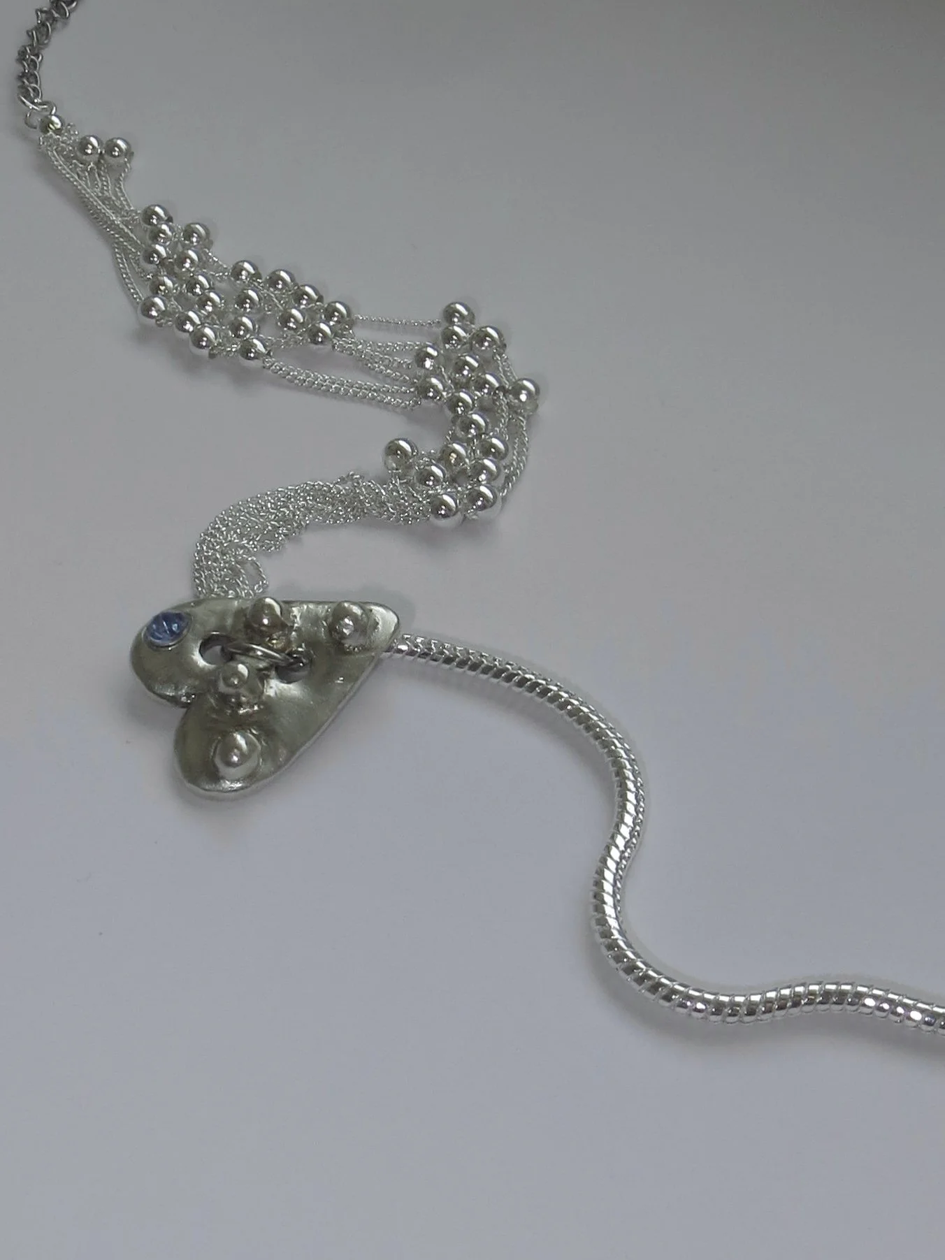 Special version of the heart button pendant, with a blue gem, connected to two chains. Snake chain on one side, cascade of mini chains with little moving balls on the other.