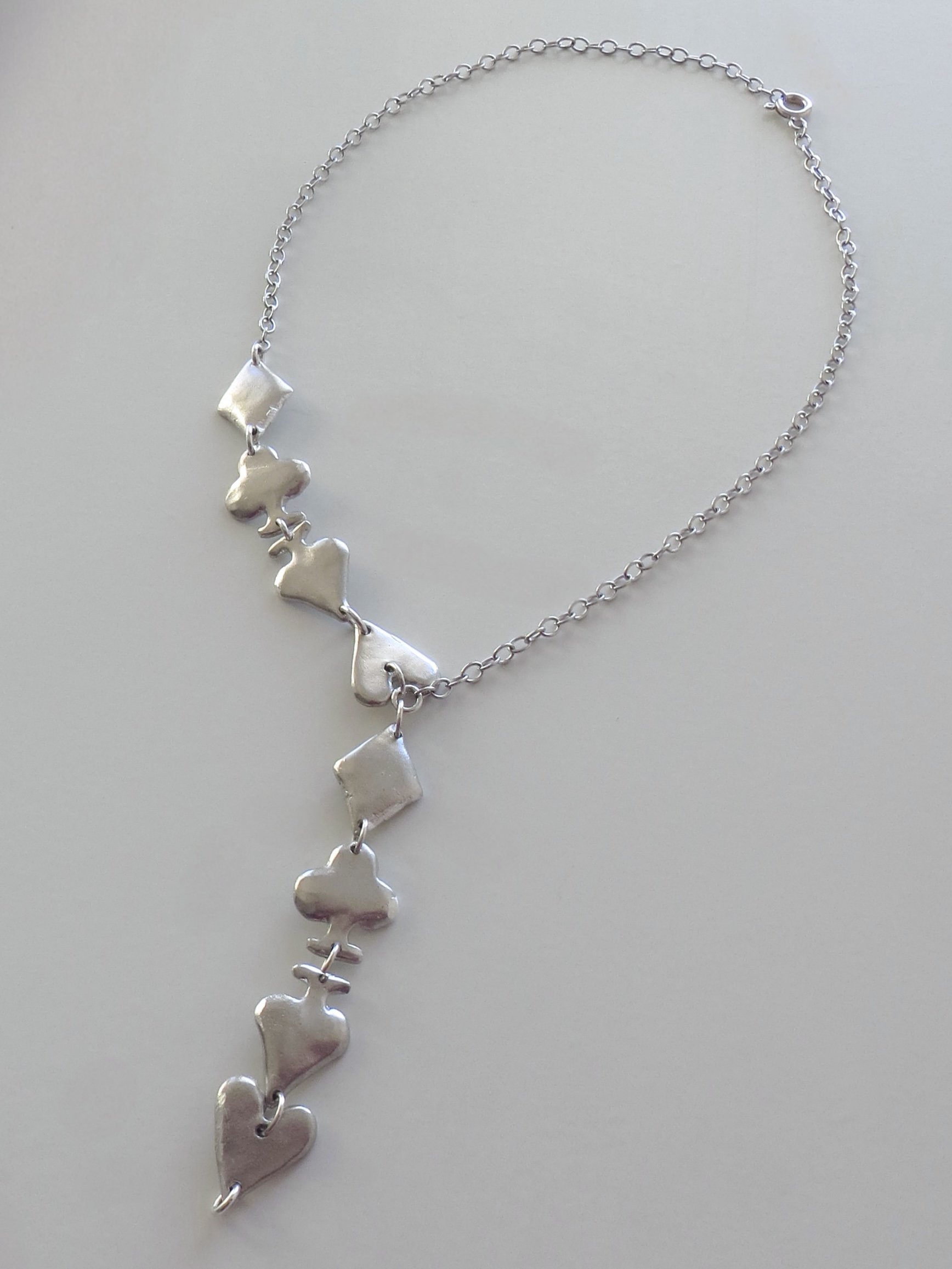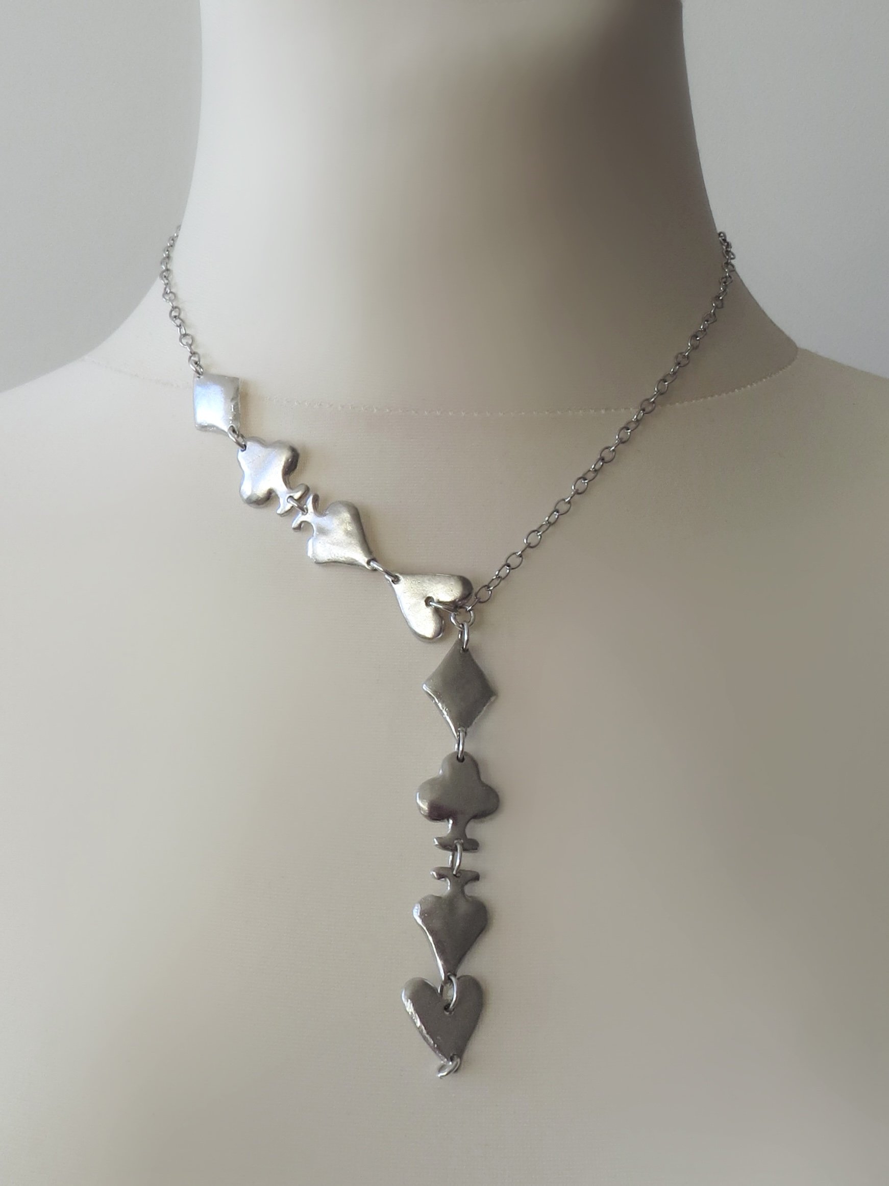 V-shaped necklace variation, lined with two sets of our handcrafted playing card suits pendants.