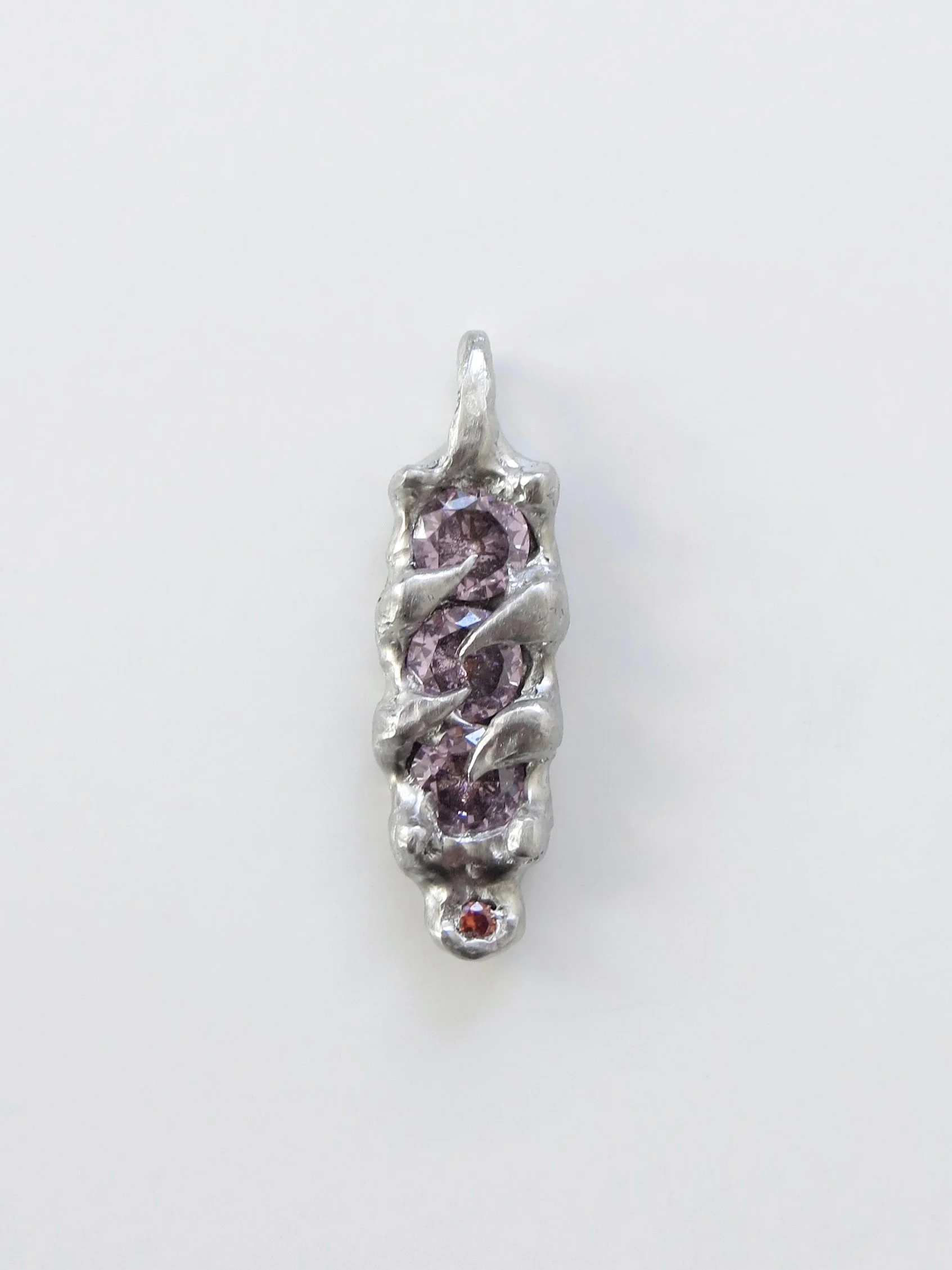 Soldered by hand from soft metal, long pendant with three center zirconias and a small red finishing accent. Suitable for chains, as well as an add-on to a necklace thanks to its adjustable open ring.